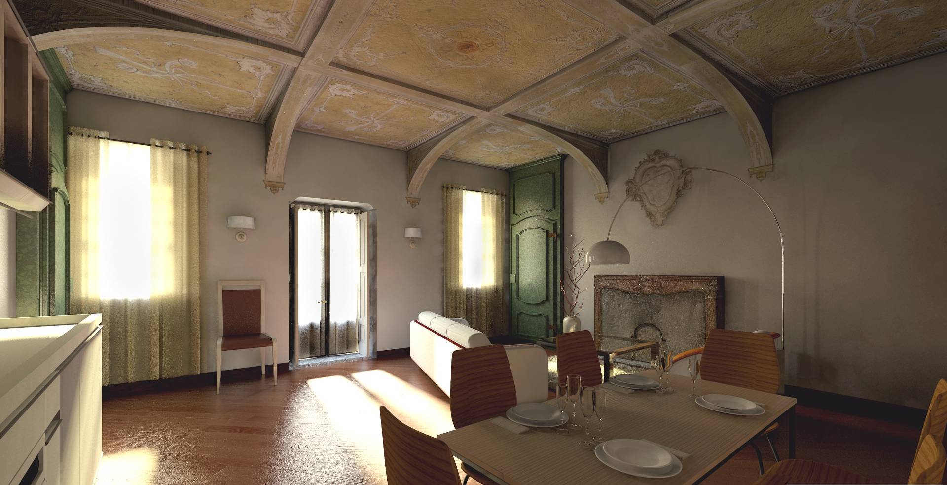 La forma a ferro di cavallo tipica dell'epoca suddivide l'immobile in tre lati , la parte centrale zona riservata alla parte padronale ,troviamo alcuni soffitti affrescati e caminetti presumibilmente da recuperare.
