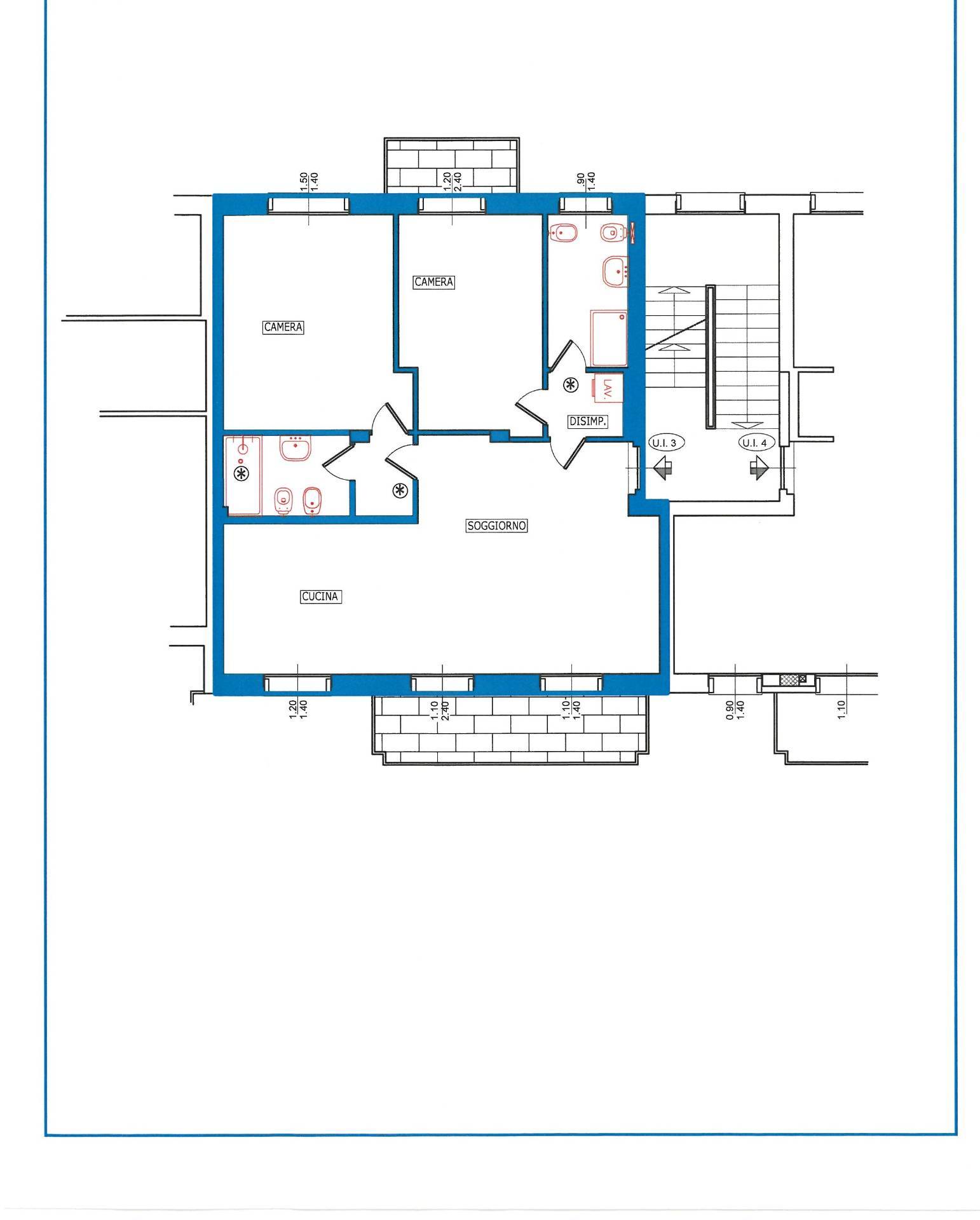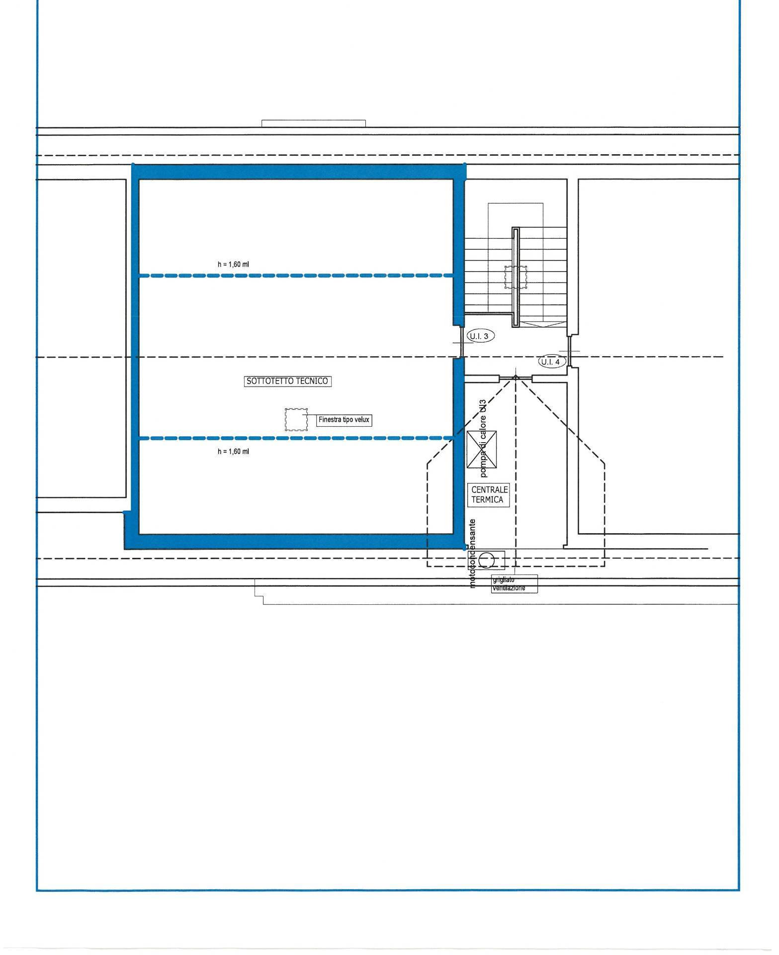 Unita' 3 al P.1: ingresso living su soggiorno con cucina abitabile a vista ( possibilità di separarla), disimpegno con 2 camere e 2 servizi di cui uno con ventilazione forzata. Sottotetto soprastante non collegato e non abitabile di open space di 37 mq sfruttabili a tutta altezza su 80, con ampio velux ad € 30.000,00