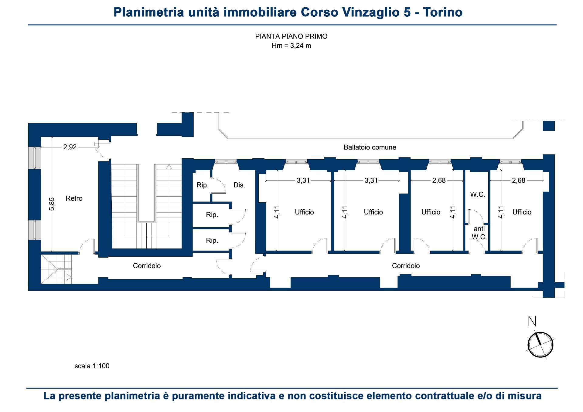 Corso Vinzaglio: in via di forte passaggio sia veicolare che pedonale, nelle immediate vicinanze della Stazione di Porta Susa e della Metropolitana, proponiamo in elegante stabile d'epoca ufficio al primo piano ammezzato composto da quattro stanze, un bagno, ripostigli / archivi, balcone con affaccio su lato cortile che garantisce privacy e tranquillità. L'ufficio è collegato ad un locale commerciale avente un vano con due vetrine al piano terra ed il retro al primo piano ammezzato accessibile da scala interna e da vano scale condominiale.