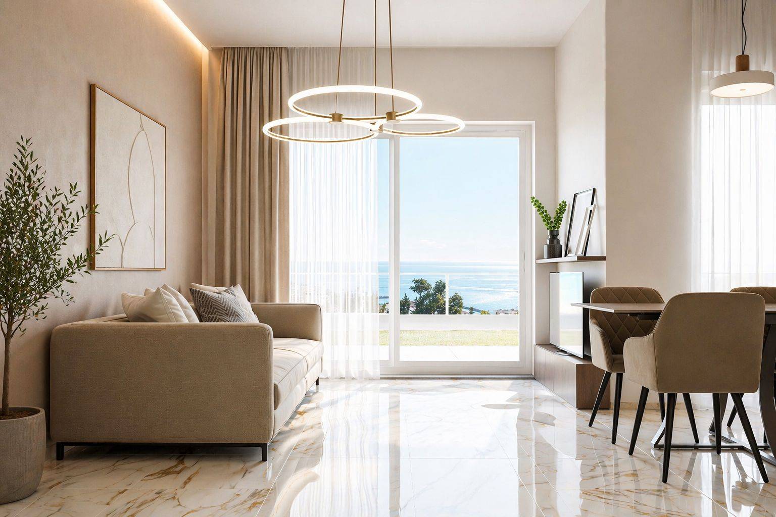 L'ingresso si apre su un soggiorno living con cucina a vista, valorizzato da ampie vetrate che conducono al solarium esterno, affacciato sul verde privato e con piacevole vista mare.