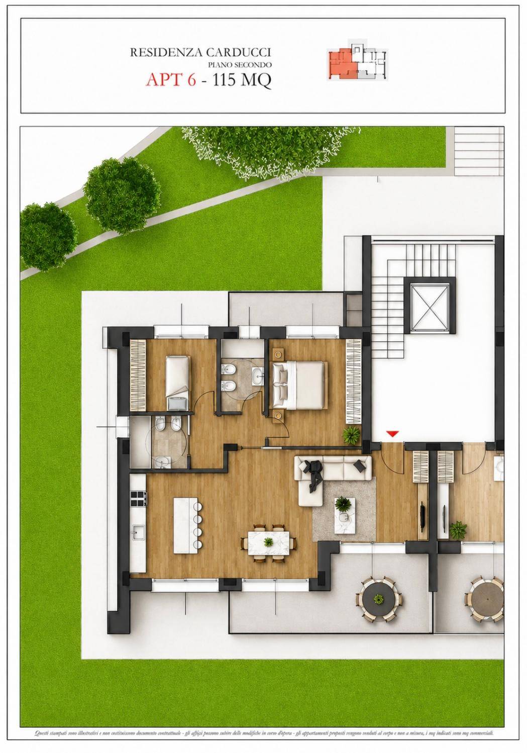 All'interno della residenza, l'unità proposta APT 6 è un quadrilocale di 115 mq commerciali al piano secondo, dotato di terrazzo solarium.