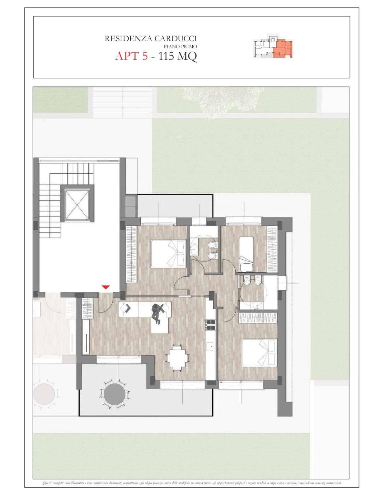 All'interno della residenza, l'unità proposta APT 5 è un quadrilocale di 115 mq commerciali al piano primo, dotato di terrazzo solarium.